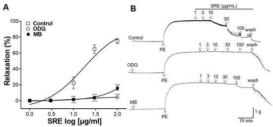 Thoracic aortic rings were pretreated with ODQ (10 μM) and MB (10 μM), and the vasorelaxant effect of SRE (1, 3, 10, 30, and 100 μg/mL) was compared with that of the control (without pretreatment) group. The vasodilatory effect was significantly suppressed in aortic rings pretreated with ODQ and MB compared to the control group (Figure 4).