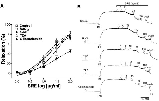 Pretreatment of vessels with BaCl2 (inward rectifier K+ channel blocker, 10 μM), 4-AP (voltage-dependent K+ channel blocker, 1 mM), TEA (Ca2+-dependent K+ channel blocker, 1 mM), and glibenclamide (ATP-dependent K+ channel blocker, 10 μM) was carried out for 20 min. After pretreatment, thoracic aortic rings were contracted with PE (1 μM), and then SRE was administered at cumulative concentrations (1, 3, 10, 30, and 100 μg/mL).