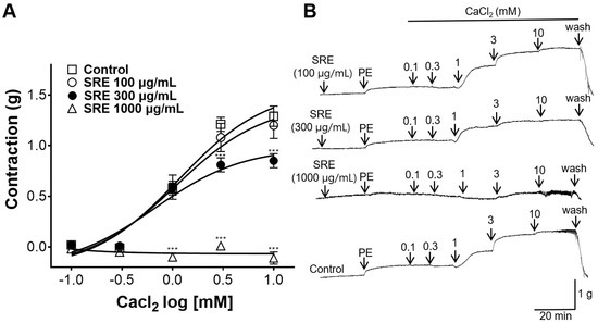 Thoracic aortic rings were pretreated with SRE (100, 300, and 1000 μg/mL), and CaCl2 (0.1, 0.3, 1, 3, and 10 mM) was administered for gradual contraction. No significant differences were observed between the group treated with 100 µg/mL of SRE and the non-treated control group (Figure 6). However, 300 and 1000 µg/mL of SRE showed inhibitory effect on Ca2+-induced contraction compared to the non-treated control group.
