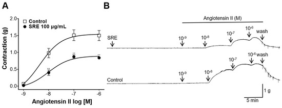 Thoracic aortic rings were pretreated with 100 µg/mL of SRE, and Ang II was administered at cumulative concentrations (10−9, 10−8, 10−7, and 10−6 M). Consequently, 100 µg/mL of SRE inhibited Ang II-induced contractions compared to the control group (Figure 7).
