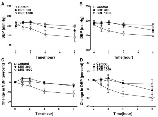 To investigate the blood pressure-lowering effect of SRE, SBP and DBP were measured at 1, 2, 4, and 8 h after the oral administration of 300 or 1000 mg/kg of SRE to SHR. The measured SBP and DBP values were compared with the control group. Because of pre-existing differences in blood pressure in individual SHRs, the difference before and after administration was calculated and was compared with the control group. The SBP and DBP values significantly decreased 4 and 8 h after the administration of 1000 mg/kg of SRE (Figure 8).