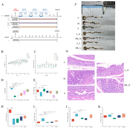 Fifty-six SPF-rated 6-week-old C57BL/6N healthy male mice were obtained (Charles River, Beijing, China) and housed in the SPF-level experimental animal room at the Beijing University of Agriculture at 22 °C ± 2 °C with 50% ± 10% humidity and a 12 h/12 h light/dark cycle, in accordance with the charter of the Animal Ethics Committee of the Beijing University of Agriculture (BUA2023069). The mice were randomly divided into seven groups of eight according to their body weight. During adaptive feeding in week one of the experiment, the mice were allowed to eat and drink water freely. The experiment began in week two, and all mice with the exception of those in the control group (group C) were injected intraperitoneally with 10 mg/kg azomethane (AOM; Sigma-Aldrich, St. Louis, MO, USA) on day one. A week later, the normal drinking water of mice was treated with 2% dextran sodium sulfate (DSS, MP Biomedicals, CA, USA) for five days, and then mice were allowed to recover for 14 days (group M). The water-change operation was repeated twice followed by a two-week recovery period each time. At the same time, different treatments were carried out. Mice in the positive control group (group F) were intraperitoneally injected with 20 mg/kg/3d of the chemotherapy drug fluorouracil (5-FU, Sigma-Aldrich, St. Louis, MO, USA). Mice in the live bacteria group (group L_L and L_H, respectively) were gavaged with 200 μL of a 1 × 109 or 1 × 1010 CFU/mL live strain suspension daily, and mice in the heat-inactivated bacteria group (group HK_L and HK_H, respectively) were gavaged with 200 μL of a 1 × 109 or 1 × 1010 CFU/mL heat-killed strain suspension daily. The body weight of all mice was recorded weekly during rearing. After the 78th day, cervical dislocation was performed, and stool and intestinal content samples were collected and stored at −80 °C. The colonic tissue was washed with phosphate-buffered saline (PBS), the colon length and the number of tumors were recorded, and the colon was cut into two lengthwise segments; one segment was stored at −80 °C and the other was fixed in a 4% phosphate-buffered formaldehyde solution.