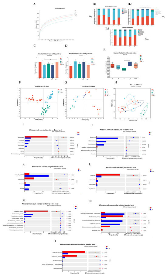 We speculated that Zhang-LL gradually regulated the structure of mouse gut microbiota at different time points to exert anti-tumor effects. We compared the changes in gut microbiota diversity in different treatment groups at weeks 0 (W0), 7 (W7), and 13 (W13) by 16S rDNA sequencing combined with biological diversity analysis. A rarefaction curve analysis of the OTUs showed that the gut microbiota were sequenced deep enough to cover the microbial diversity of the sample (Figure 2A). The first collection of mouse feces at W0 was not subjected to any treatment, and the phyla between different groups showed a similar composition, with Firmicutes and Bacteroidetes as the main flora (Figure 2(B1)); there was no significant difference in α diversity. W7 was the time point in the mold-making process (Figure 2(B2)), and it was found that the ratio of Firmicutes to Bacteroidetes increased in group M, but the difference was not significant. At W13, after the euthanasia of mice (Figure 2(B3)), significant changes in Firmicutes and Bacteroidetes were observed (Figure 2C,D), indicating gut microbiota dysbiosis in group M during the modeling process, while L_H and HK_H partially reversed intestinal dysbacteriosis. Compared with the other treatment groups, the Sobs, Chao, ACE, Simpson, and Shannon indices of group F decreased, but only the Sobs index decreased significantly (p < 0.05) (Figure 2E), indicating that the administration of chemotherapy drugs reduced the abundance of gut microbiota.