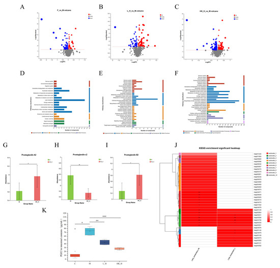 L_H and HK_H alter gut microbiota-related metabolites in AOM/DSS mice. Volcano plot of differential metabolites between mice in the (A) group F and group M, (B) group L_H and group M, and (C) group HK_H and group M. Pathway enrichment analysis of differential metabolites between mice in (D) group F and group M, (E) group L_H and group M, and (F) group HK_H and group M. Differences in the relative abundance of (G) PGA2, (H) PGC2, and (I) PGB2 in groups HK_H and M. (J) Lipid metabolism-related pathway enrichment heat map in groups L_H and HK_H. (K) Levels of PGE2 (pg/mL) in intestinal contents of mice. Data are presented as mean ± standard deviation (SD). n = 6. p < 0.05, *; p < 0.01, **; p < 0.001, ***.