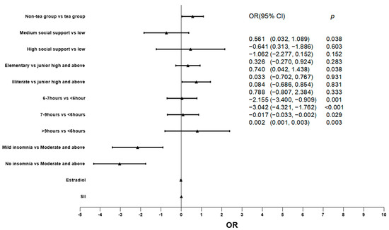 The factors that may affect the degree of depression were included in the regression model, and the relationship between green tea consumption and degree of depression was explored by ordered logistic regression. The results show that the green tea group has a lower degree of depression (p = 0.038). In addition, the concentration of SII (p = 0.003) and estradiol (p = 0.029) were also significantly correlated with the degree of depression. (For more details, see Table 3 and Figure 1.)