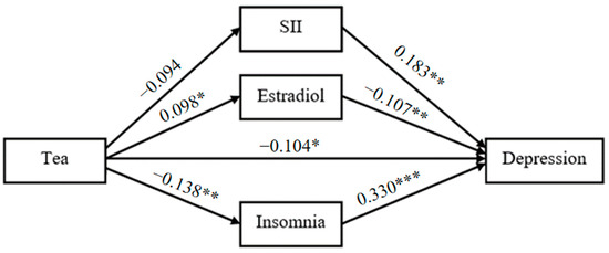 With tea drinking as the independent variable, the degree of depression as the dependent variable, SII, estradiol and the degree of insomnia as the mediating variables, a structural equation model was constructed (Figure 1). The fitting indexes of the structural equation model were as follows: χ2/df = 1.297, GFI = 0.996, RMSEA = 0.028, CFI = 0.990, AGFI = 0.980, NFI = 0.960, TLI = 0.966. The results showed that there are significant indirect effects of SII, estradiol and insomnia on the relationship between tea drinking and the degree of depression (Table 4 and Figure 2). The total indirect effect of tea drinking on the degree of depression was −0.094 (SE = 0.030, 95% CI [−0.160, −0.043], p < 0.001), accounting for 45.2% of the total effect. Considering that the direct effect was not significant (−0.088, SE = 0.061, 95% CI [−0.183, 0.009], p = 0.083), tea drinking could majorly influence the degree of depression by the mediating variables including SII, estradiol and the degree of insomnia. The mediating effects of SII, estradiol and the degree of insomnia were all significant, were −0.022 (SE = 0.012, 95% CI [−0.055, −0.003], p = 0.025), −0.014 (SE = 0.008, 95% CI [−0.032, −0.001], p = 0.030) and −0.059 (SE = 0.025, 95% CI [−0.118, −0.018], p = 0.004), and accounted for 10.3%, 6.7% and 28.2% of the total effect, respectively. Figure 2 displayed the standardized path coefficients of the mediation model.