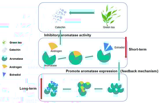 Some researchers pointed out in the paper that catechins (the main active substance of green tea) can inhibit aromatase activity so green tea consumption will lead to a decrease in estradiol synthesis, but due to the existence of a feedback mechanism, long-term inhibition of aromatase activity may lead to increased expression of aromatase, which may instead promote an increase in estradiol synthesis (Figure 3) [54,55]. There may be similar effects on other hormones. This may also be an important reason for the inconsistent conclusions on the correlation between green tea and hormones as many studies have ignored the length of green tea consumption history. But, this view still needs further research and evidence in the future, and the length of different tea drinking history may have different degrees and even different directions on the secretion of hormones.