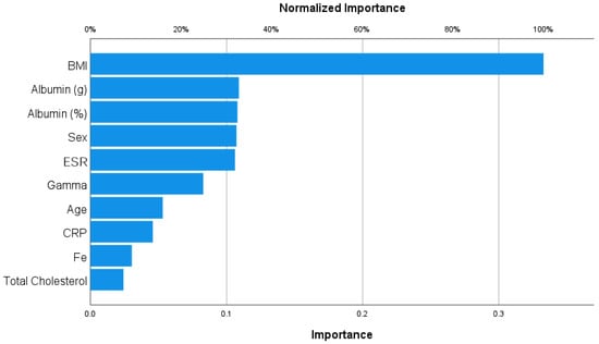 As shown in Figure 1, the only important variable was BMI (importance = 0.333; normalized importance 100%). As shown in the logistic regression analysis, it was a protective factor.