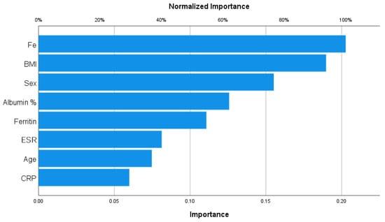 With regard to sarcopenic obesity (Figure 2), Fe and BMI were the most important variables and were protective factors (importance = 0.203, 0.190, respectively; normalized importance, 100%; 93.6, respectively).