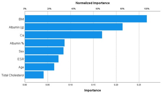Body Mass Index (BMI) and albumin (g) were the most important variables and were protective factors to osteosarcopenia, as shown in Figure 3 (importance = 0.267, 0.214, respectively; normalized importance, 100%, 80.1, respectively).