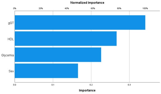 Concerning osteosarcopenic obesity (Figure 4), among all the associated variables, gGT was the most impactful factor on this phenotype (importance = 0.342; normalized importance, 100%).
