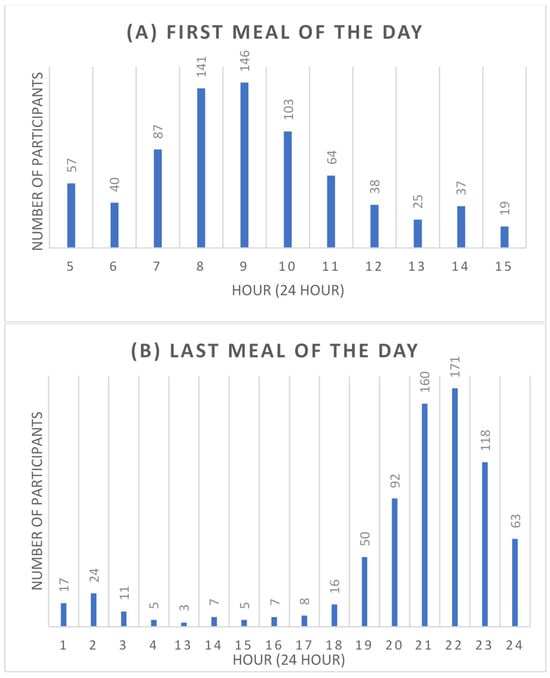The number of participants consuming the first and last meals of the day by the hour. (A) A bar graph showing the number of participants who consumed the first meal of the day at each hour. (B) A bar graph showing the number of participants who consumed the last meal of the day at each hour.