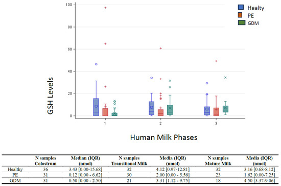 Box-plot of GSH by lactation stage and pathology. Median and interquartile range (IQR) were reported for each lactation stage (1 = Colostrum; 2 = Transitional milk; 3 = Mature milk). A p < 0.05 was used to define statistical significance. Preeclamptic group (PE); Gestational diabetes mellitus group (GDM); Healthy women group (Healthy).