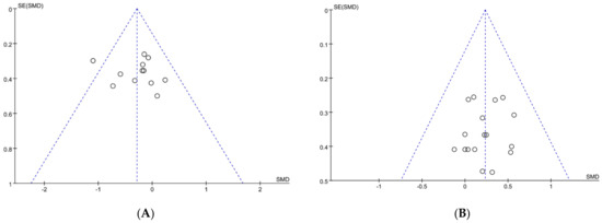 As shown in Figure 2, a standard funnel plot was made to assess publication bias. We found that the literature on exercise tolerance showed overall good symmetry, while the literature on performance tests exhibited some degree of asymmetry. Additionally, one study, Nieman et al. [44], surpassed the boundary of funnel plot. So, to further validate the potential presence of publication bias, an assessment was conducted using Egger’s statistical test. As a result, we found no publication bias for performance tests and exercise tolerance with an observed significance level p > 0.05 [45]. It is worth noting that the article by Nieman et al. did not have a bias risk and should be included in our analysis [44]. To sum up, publication bias was not presented in our included literature, all the papers could be used to conduct the meta-analysis.