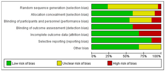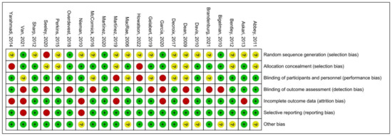 The quality assessment of the experiments was conducted based on the “Cochrane Collaboration Guidelines for Assessing Quality in Experiments” [37,38]. This evaluation encompassed seven vital criteria: ensuring participants’ random assignment (Random Sequence Generation); maintaining the concealment of trial group allocation (Allocation Concealment); making certain both participants and personnel are unaware of group assignments (Blinding of Participants and Personnel); verifying that those assessing outcomes are blinded to group designations (Blinding of Outcome Assessment); addressing any potential gaps in trial data (Incomplete Outcome Data); ensuring all study results, whether favorable or not, are reported (Selective Reporting); and considering any other possible biases (Other Bias). The results are shown in Figure 3, where each item was expressed as a percentage relative to the total number of studies included. We found that there was an unclear risk of bias on random sequence generation due to 16 papers out of 22 being ambiguous about their random assignment methods. In addition, the remaining six factors of quality assessment were identified as low risk. Meanwhile, Figure 4 presented the risk of bias for each study as well. Hence, we believed the quality assessment of the experiments of all included studies presented a low risk. Therefore, we were able to proceed with a meta-analysis.