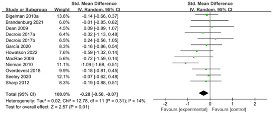 The standardized mean difference (SMD) involved the use of mean ± SD from experimental and control groups to standardize the difference in means, while the Effect Size (ES) was typically the weighted average of the SMD. Both were statistical measures used to quantify the magnitude of the difference between experimental and control groups. In our study, the SMD was calculated using Hedges’ g and it was used as an estimate for the effect size. Therefore, in this context, SMD and ES were equivalent [40,41,42]. The evaluation criteria of ES followed Cohen criteria: <0.2, trivial; 0.2–0.5, small; 0.5–0.8, moderate; and >0.8, large [43]. It was notable that a negative ES for a performance variable suggested an ergogenic effect. The statistics I2 indicated the degree of heterogeneity between studies [37]: 25–50%, small inconsistency; 50–75%, moderate inconsistency; and >75%, high inconsistency [43].
