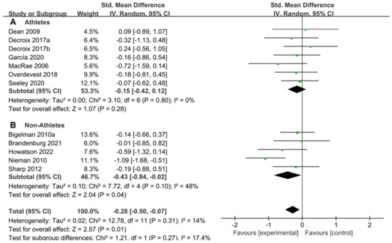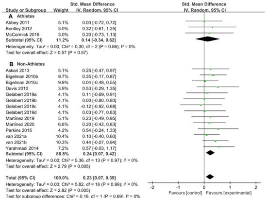 For the subgroup analysis of athletes and non-athletes, Figure 6A suggested that flavonoid supplementation revealed no effect on performance tests in athletes. Conversely, as shown in Figure 6B, flavonoid supplementation presented a significant effect on the performance tests in non-athletes.