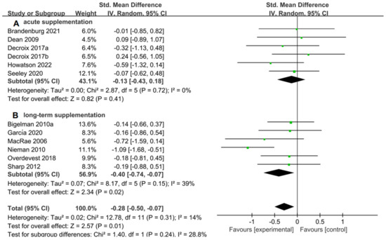 Although a significant effect had been observed in healthy adults based on the above discussion, we still would like to investigate the effects of flavonoids on both athletes and non-athletes, as well as examine the impact of acute supplementation and long-term supplementation duration. In this study, the distinction between athletes and non-athletes is determined by whether they have undergone systematic professional training. Additionally, the categorization between acute supplementation and long-term supplementation is made based on the duration of flavonoid supplementation. Specifically, if the supplementation lasts for more than 7 days, it is viewed as long-term supplementation, while anything less is regarded as acute supplementation [59].