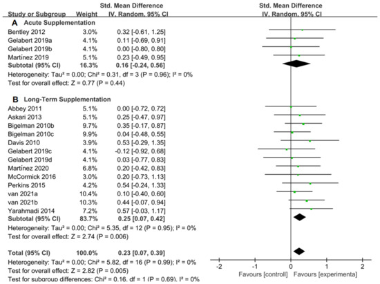 For the subgroup analysis of acute supplementation and long-term supplementation. Figure 7A suggested that flavonoid supplementation revealed no effect on performance tests in acute supplementation. However, as shown in Figure 7B, flavonoid supplementation presented a significant effect on the performance tests when long-term supplementation duration was conducted.