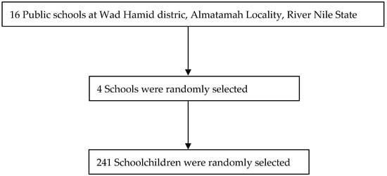 Initially, from the seven localities, one locality (Almatamah) was randomly selected using simple random sampling. Then, Wad Hamid was selected randomly from the three districts of the Almatamah locality. From a total of 16 schools in the Wad Hamid district, four public schools for girls and boys were selected randomly. The total list of students in these four schools was obtained from the schools’ managers. Then, certain numbers of students from each school were selected randomly from the provided list based on each school’s total number of students to reach the desired sample size (n = 241) (Figure 1). The investigators trained four research assistants to collect the data. After signing an informed consent form, the questionnaires (from each student) were completed by the research assistants. This questionnaire was based on similar previous studies [6,7,10,11,12,29]. The questionnaire contained questions about sociodemographic data, such as gender (male or female), age in years, and parents’ education (secondary level and ≥ secondary) and occupation status.