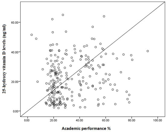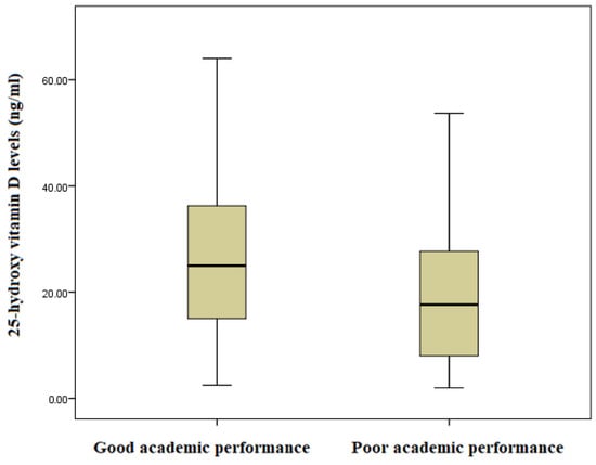The average overall academic score was 33.74%. Of the 241 enrolled participants, 95 (39.4%) and 149 (61.6%) had good (more than average) and poor (less than average) academic performances, respectively. The median (IQR) of serum 25(OH)D was significantly lower among adolescents with poor academic performance compared to adolescents with good academic performance (17.65 [8.0–27.78] vs. 25.0 [14.72–36.44], p = 0.001) (Figure 3). The levels of vitamin D deficiency among participants with poor and good academic performance were 81 (55.5%) and 36 (37.9%), p = 0.008, respectively.