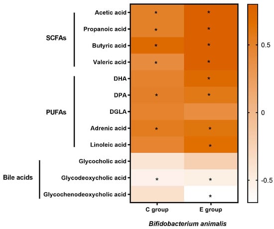 3.9.1. Correlation Analysis of Bifidobacterium animalis and the Most Regulated Metabolites