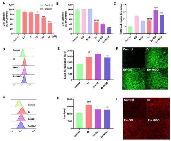 Biological evaluations of ferroptosis in HaCaT cells exposed to erastin, GO, MGO, and their combinations. (A) Effects of erastin (Er) (2.5–40 µM) on the cell viability of HaCaT cells. (B) Effects of stimulations with GO, MGO, and erastin alone as well as their combinations (Er + GO, and Er + MGO) on the cell viability of HaCaT cells. (C) Effects of MGO, GO, Er, Er + GO, and Er + MGO on the total production of ROS in HaCaT cells. (D) Flow cytometry assay for the lipid peroxide in HaCaT cells with the Liperfluo staining reagent. (E) Quantitative analysis of lipid peroxide detected by fluorescence signals. Data are shown as the averaged FITC values. (F) Images of lipid peroxidation in HaCaT cells exposed to erastin (20 μM) without or with GO or MGO (100 μM) for 24 h. (G) Flow cytometry analysis of intracellular iron using the FerroOrange staining reagent. (H) Quantitative analysis of Fe2+ detected by the fluorescence signals. Data are shown as the averaged PE values. (I) Images of FerroOrange stained HaCaT cells exposed to erastin (20 μM) without or with GO or MGO (100 μM) for 24 h. #### p < 0.0001, ### p < 0.001, # p < 0.05 as compared with the control group; * p < 0.05, *** p < 0.001 and **** p < 0.0001 as compared with the control and erastin-treated group.