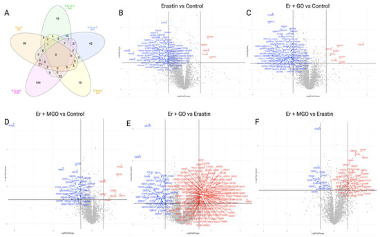 Effects on the number of proteins with significant changes in HaCaT cells exposed to erastin, GO, MGO, and their combinations by Venn diagrams and volcano plots. (A) Venn diagrams of proteins that were significantly enhanced or suppressed (p < 0.05) by at least 50% between the two comparing groups. (B–F) Volcano plots for the differential expression of proteins between different stimulation groups: Erastin vs. Control (B), Er + GO vs. Control (C), Er + MGO vs. Control (D), Er + GO vs. Erastin (E), and Er + MGO vs. Erastin (F). The volcano plots were generated using a cut-off value of 0.58 (1.5-fold change) and a p-value < 0.05. The x-axis represents the log2 fold change, and the y-axis represents the negative log10 p-value. Proteins with a log2 fold change above the cut-off and a p-value below the significance threshold are shown in red (upregulated) or blue (downregulated).