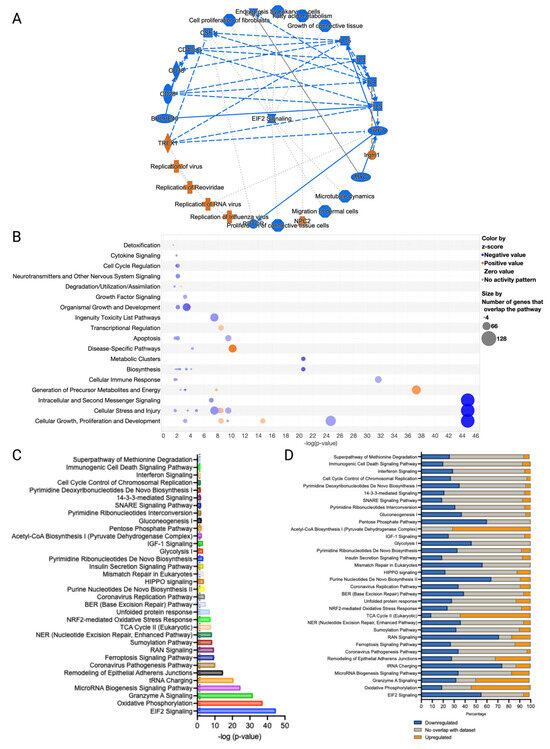 (A) Changes in canonical pathways and upstream regulators in the erastin-exposed group vs. control group. Canonical pathways and upstream regulators that were significantly activated (indicated by orange) or suppressed (indicated by blue) are shown. (B) Bubble chart summarizing proteins based on their −log(p-value). Proteins are color-coded by their z-score, with orange indicating a positive value and blue indicating a negative value. The size of each bubble corresponds to the number of genes that overlap the pathway. (C) Ingenuity canonical pathways of signaling pathways involved in erastin-exposed cells. Only pathways with a cut-off value of −log(p-value) > 1.3 and z-score > 2 are shown. (D) Horizontal stacked bar chart showing the percentage of downregulated, no overlap with the dataset, and upregulated proteins in the erastin group vs. control group.