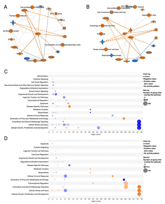 Changes in canonical pathways and upstream regulators in the (A) Er + GO-exposed group or (B) the Er + MGO-exposed group vs. the erastin group. Canonical pathways and upstream regulators that were significantly activated (indicated by orange) or suppressed (indicated by blue) are shown. Bubble chart summarizing proteins changes in (C) Er + GO- and (D) Er + MGO-exposed group based on their −log(p-value). Proteins are color-coded by their z-score, with orange indicating a positive value and blue indicating a negative value. The size of each bubble corresponds to the number of genes that overlap the pathway.
