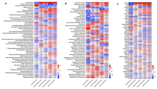 Comparison of the canonical pathways, diseases and functions, and upstream regulators among all the groups to identify significant differences in cells exposed to different stimulations. (A) Comparison analysis was performed using a cut-off value of −log(p-value) > 1.3 and z-score > 2. The heatmap displays the results of this analysis, with numbers indicating the z-score. Panel (A) shows the top 50 canonical pathways selected from 166 signaling pathways. Panel (B) shows the top 50 diseases and functions selected from 347 options. Panel (C) shows the top 50 upstream regulators selected from 209 options.