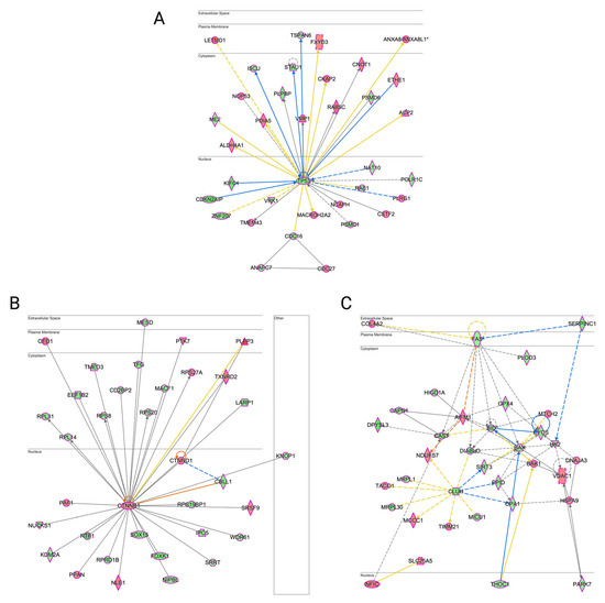Network diagram depicting the protein targets involved in the network. Red nodes represent upregulated molecules and green nodes represent downregulated molecules. (A) Molecule network associated with cell cycle, cell death and survival, and embryonic development in each group. The presence of an overlap between ANXA8 and ANXA8L in the networks was indicated by the use of the asterisk (*) (B) Molecule network associated with cell death and survival, DNA replication, recombination, and repair in each group. (C) Molecule network associated with cell death and survival, embryonic development, and organismal injury and abnormalities in each group.