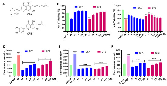 We next sought to study the cytoprotective effects of a library of dietary natural products against RCSs + erastin-induced cell death. It was noted that a chemotype of natural products, namely, flavonoids, showed promising antioxidant and cytoprotective effects against ferroptosis in a preliminary screening study. This was not surprising given that flavonoids from dietary resources are reported to exert various anti-aging activities including cytoprotective, antioxidant, anti-glycation, and anti-inflammatory effects [64,65]. Furthermore, a group of flavonoids with unique chemical structures (with a prenyl or geranyl moiety on the flavonoid skeleton) from the cannabis plant (C. sativa) showed promising cytoprotective effects. Although cannabis compounds are reported to show anti-aging effects in skin models [66], most of the research efforts have been directed to investigate the cannabinoid-type of phytochemicals. However, the anti-aging effects of other constituents of cannabis, such as flavonoids, remain unclear. Therefore, based on our preliminary data and literature reports, we further selected two representative flavonoids (i.e., CFA and CFB) from cannabis as chemical probes to investigate the potential anti-skin-aging effects in a cell death model with RCSs and erastin.