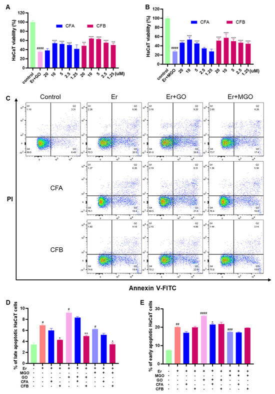 The effects of CFA and CFB on Er + GO (A) and Er + MGO (B) induced the cell viability of HaCaT cells. (C) Flow cytometry dot plots of Er-, Er + GO-, and Er + MGO-induced apoptosis in HaCaT cells. Changes in the percentage of late (D) and early (E) apoptosis stage in HaCaT cells. # p < 0.05, ## p < 0.01, ### p < 0.001, #### p < 0.0001 as compared with the control group, * p < 0.05, ** p < 0.01, *** p < 0.001, **** p < 0.0001 as compared with Er, Er + MGO, or Er + GO group.