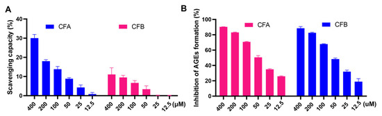 Antioxidant capacity is identified as a key mechanism that involves in the anti-ferroptosis [67] and anti-apoptosis [68] effects of dietary natural products. Thus, we conducted two antioxidant assays including the DPPH free radical scavenging and AGEs inhibition assay. In the DPPH assay, CFA (concentrations ranged from 12.5 to 400 μM) showed an antioxidant capacity with a free radicals scavenging rate of 0.8–26.8%, respectively. CFB showed a weaker antioxidant capacity with a scavenging rate of 0.0% to 11.1% at 12.5–400 μM, respectively. In the AGEs inhibition assay, both CFA and CFB showed promising anti-glycation effects against MGO-induced AGEs formation of 25.9%, 35.0%, 50.5%, 70.7%, 83.1%, and 90.4%, and by 19.0%, 31.9%, 48.3%, 67.9%, 82.6%, and 88.6%, at the concentrations of 12.5, 25, 50, 100, 200, and 400 μM, respectively (Figure 9).