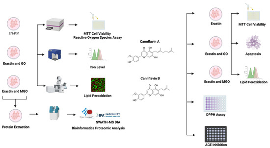 Workflow for the cellular bioassays to evaluate the effects of GO and MGO on erastin-induced ferroptosis in human keratinocytes by examining ferroptosis-related biomarkers including cell viability, ROS production, cellular iron levels, and lipid peroxidation. Next, a SWATH-MS-based DIA was conducted for proteomic analyses to identify molecular targets (including proteins and pathways) that were involved in ferroptosis with or without the presence of GO or MGO in HaCaT cells exposed to erastin, GO, MGO, and their combinations. Lastly, the cytoprotective effects of CFA and CFB against erastin and combinations of erastin + GO- and erastin + MGO-induced cell death. This scheme is created with BioRender (https://app.biorender.com/; accessed on 16 July 2023; Toronto, Ontario, Canada).
