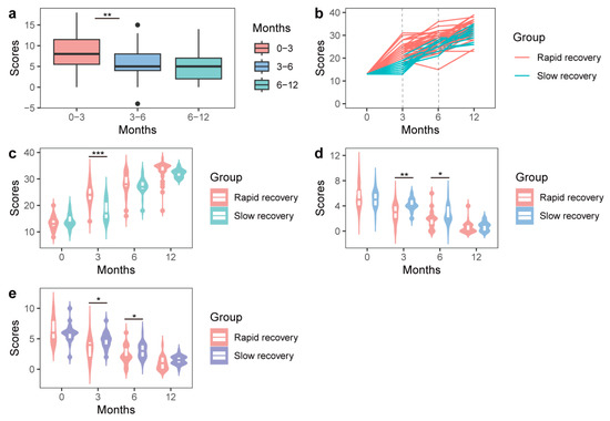 Shoulder functions at different time points. (a) UCLA shoulder scores for all patients at different time points. (b) Patient grouping according to the changing patterns of the UCLA shoulder scores postoperatively. (c–e) Differences in the UCLA shoulder scores (c) and VAS scores ((d) activity and (e) rest) between the rapid recovery and slow recovery groups at different time points. * Student’s t-test, p < 0.05, ** p < 0.001, *** p < 0.0001.