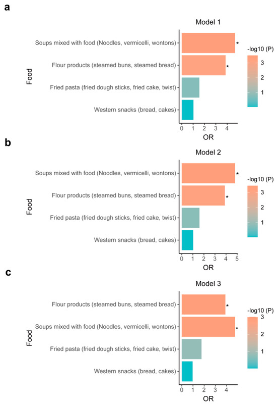 The association between rapid postoperative RC recovery and habitual intakes of four types of wheat-flour foods. (a) Model 1—no adjustment. (b) Model 2—adjusted for age and gender (c) Model 3—adjusted for age, gender, BMI, smoke, and marriage. Abbreviations: FFQ, Food Frequency Questionnaires; OR, odds ratio; BMI, body mass index. * Logistic regression analysis, p < 0.05.