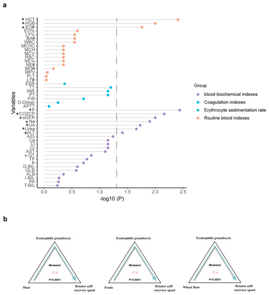 To identify the possible mediating factors underlying the association between RC recovery speed and the beneficial dietary habits observed above, we utilized blood indicators, sunch as blood routine indexes, the erythrocyte sedimentation rate, coagulation indicators, and blood biochemical criteria as the mediating factors for mediation analysis. For the hypothesized mediation model, the independent variable was habitual diet and the dependent variable was the postoperative recovery speed for the rotator cuff. First, we performed correlation analysis and determined that aberrant blood levels of EO, HCB, HCT, ALT, urea, UA, Na, P, CO2CP, and eGFR were significantly associated with rapid RC recovery (Figure 4a). Further mediation analysis on these mediating effect of the rapid recovery and habitual intakes of meat (mediation proportion = 17.5%, P-mediation < 0.0001), fruits (mediation proportion = 17.9%, P-mediation < 0.0001) and wheat flour foods (mediation proportion = 11.4%, P-mediation < 0.0001) (Figure 4b). It reveals that EO was a potential mediator of the association.