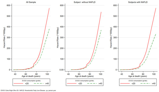 The protective effect of high consumption compared to low consumption of EVOO is even more evident when the mortality rate by age is observed. These results showed that the protection is mainly seen in older adults, and the effect is even stronger in older adults and in subjects affected by NAFLD.