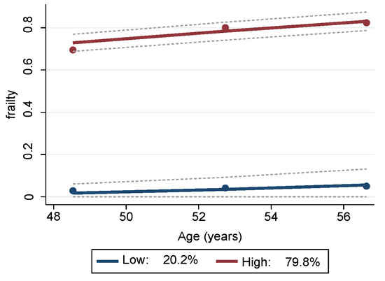 Trajectories of frailty status of HANDLS study sample over time. Notes: Y axis represents average proportion frail at each mean age per wave. Blue represents mostly “non-frail throughout follow-up” and red represents “pre-frail/frail throughout follow-up”. Dashed lines are 95% pointwise confidence intervals on the estimated trajectories. Note: HANDLS, Healthy Aging in Neighborhoods of Diversity across the Life Span.