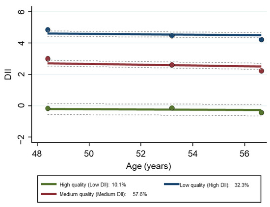 Three diet quality trajectory groups were identified (Table S2). They were labeled by their inflammatory potential—high, medium, or low quality, according to their DII scores. Low quality reflects anti-inflammatory (negative) scores while medium and low quality reflect pro-inflammatory (positive) scores. The mean (±SE) DII scores by trajectory for each visit are provided in Table S3 and displayed in Figure 2.