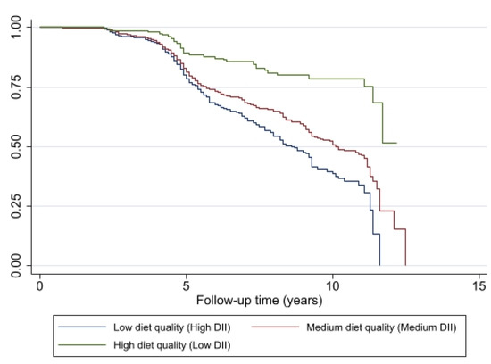 The probability for remaining non-frail was lower at each year of follow-up among individuals with pro-inflammatory diets (high and medium DII) compared with individuals with an anti-inflammatory diet (low DII), based on the Kaplan–Meier curves and the log-rank test (p < 0.001) (Figure 3). The lowest probability for being pre-frail or frail was associated with better diet quality, a diet with a DII score indicating an anti-inflammatory potential.