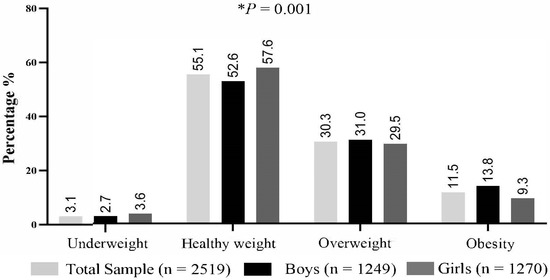 Child weight status in sample population. Abbreviations: %, percentage; n, sample size. Child weight status as defined by the international body mass index cut-offs for thinness, overweight and obesity (IOTF) [44,53]. The asterisk (*) indicates statistically significant difference between boys and girls.