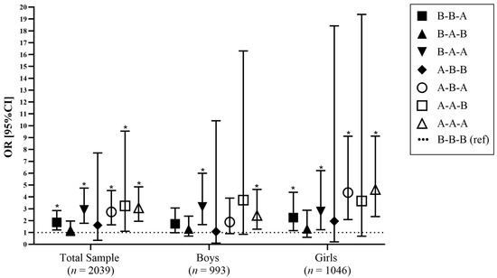 Overall, girls were found to have the highest odds ratio in the above–above–above category (4.62 [2.34, 9.12]). There were specific time-points that, when combined, could also create a higher risk for childhood obesity, compared to children with mothers within the healthy ranges or reference ranges. Specifically, there were higher odds ratios for children born to mothers who were above thresholds for at least one of the maternal time-points investigated. More specifically, for mothers who were above the healthy threshold at their child’s pre-adolescence, the likelihood for childhood obesity increased by 1.9 times in the total sample (1.21, 2.84), 1.7 times in boys (0.98, 3.06), and 2.3 times in girls (1.16, 4.39).