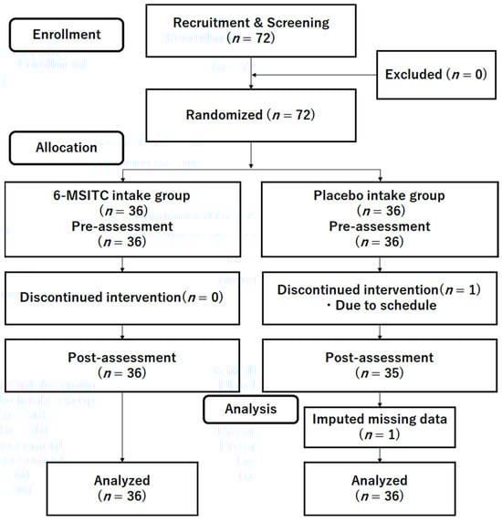 We set the dose of 6-MSITC (0.8 mg) based on previous findings using 6-MSITC. There were two reasons. First, the dose of 6-MSITC differed among previous studies (from 0.8 to 9.6 mg). Previous studies with 4.8 mg or 9.6 mg of 6-MSITC were conducted using a pre–post intervention design without control groups [,]. However, only one study used the RCT design []. This previous RCT study with 0.8 mg of 6-MSITC showed positive effects on cognitive functions in middle-aged adults []. Second, a previous safety evaluation study using a five-time overdose revealed that an intake of 0.8 mg of 6-MSITC per day did not have side effects on human health []. Based on these findings, we used 0.8 mg of 6-MSITC in this study. Kinjirushi Co., Ltd. (Nagoya, Japan) provided the 6-MSITC and placebo capsules.