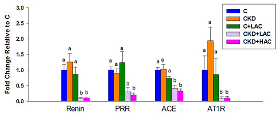 As the RAS contributes to the regulation of BP and AC has been shown to regulate the RAS, we further evaluated whether the protective actions of AC were related to this mechanism. As observed (Figure 8), AC treatment, either low- or high-dose, caused a lower expression of renin, PRR, ACE, and AT1R in the CKD + LAC and CKD + HAC groups compared with the CKD group. However, AC treatment had a negligible effect on the RAS in the C + LAC group.