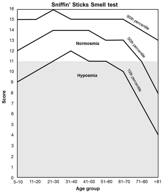 - Oleszkiewicz, A.; Schriever, V.A.; Croy, I.; Hähner, A.; Hummel, T. Updated Sniffin’ Sticks Normative Data Based on an Extended Sample of 9139 Subjects. Eur. Arch. Otorhinolaryngol. 2019, 276, 719–728. [Google Scholar] [CrossRef]
