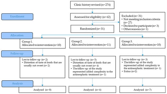 The inclusion criteria include patients over 18 years of age with cancer and antineoplastic treatment (chemotherapy and any other treatment such as radiotherapy, immunotherapy, etc., for at least three months) who have a weight loss ≥ 5%, malnutrition assessed by the GLIM criteria [23], and taste disturbances measured by electrogustometry. Additionally, these patients must be starting or be in the first three months of antineoplastic treatment, have a life expectancy greater than 3 months, and be capable of oral intake of food and drinks. Patients also must be be at an appropriate cultural level and understand the clinical study, voluntary participation, and sign the informed consent form.