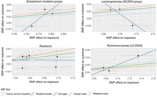 Scatter plots for the casual association between gut microbiota (Eubacterium (nodatum group), Lachnospiraceae (NC2004 group), Roseburia and Ruminococcaceae (UCG004)) and glaucoma. Each point in the scatter plot represents an SNP. The effect of the same SNP on exposure is placed on the horizontal axis, and the effect on outcome is placed on the vertical axis. The vertical and horizontal lines show the 95% CI for each SNP. At this point, the slope of the solid line in the plot is each MR estimate. The light blue, light green, dark blue, green, and pink lines correspond to the Inverse Variance Weighted, Simple Mode, MR-Egger, Weighted Median, and Weighted Model methods, respectively. SNP, single nucleotide polymorphism.